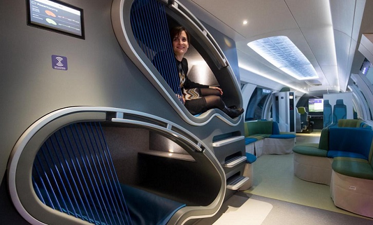 También encontramos espacios para recostarse o salas dedicadas a quienes viajan de negocios. Estas últimas cuentan con cancelación de ruido y mesas de trabajo. Algo que destaca del tren es que cuenta con sillas que pueden girarse con el fin de que el pasajero decida si quiere viajar de frente, de espaldas o mirando el horizonte.